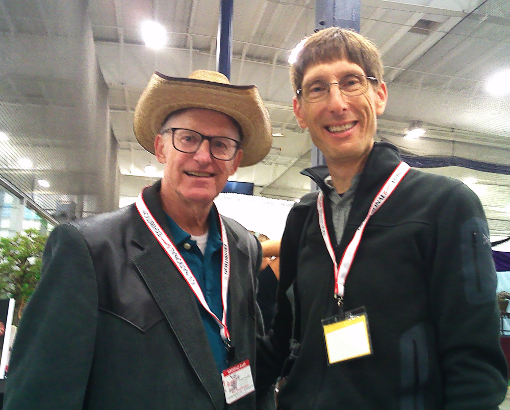 Additionally, I finally got to see Bill Valavanis' place on Sunday. On Saturday, I stopped by one of the three video crews roaming the exhibition, and introduced myself. This led to me being drafted for a 15-minute interview on camera as part of a documentary about Bill that the crews were assembling. I was able to reverently touch the foliage and trunk of a shohin Matsudaira maple that was on display from Bill's collection.