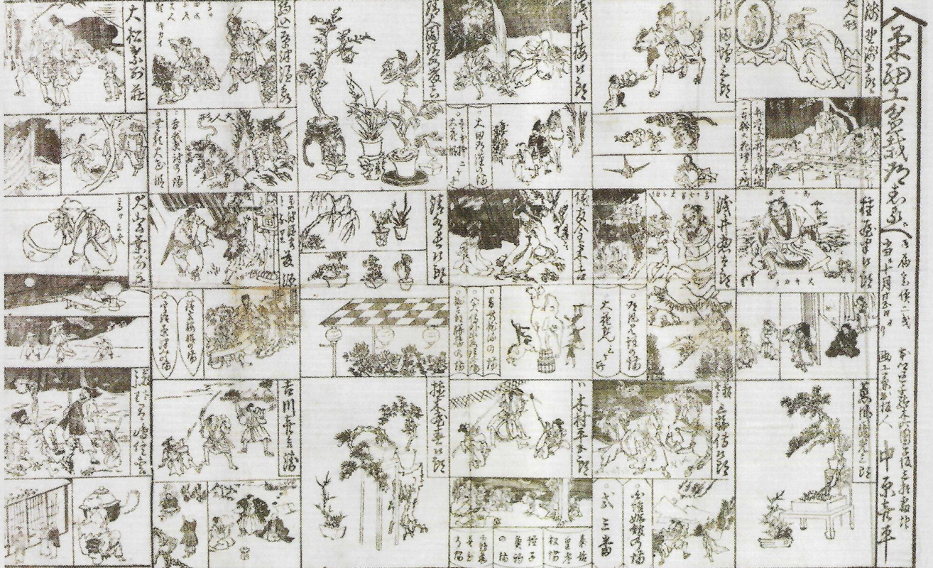 Kiku-Zaiku Bonsai Michishiube (Bonsai Chrysanthemum Flower Art Information Sheet) This Meiji Period list ranks chrysanthemum dolls. On the top row in the third column, it says "Seidai-en Tokichi Shimizu" (from The Birth of Omiya Bonsai Village, pg. 5) Tokichi Shimizu (1841-1905), the first-generation owner of Seidan-en, had been mainly creating kiku-ningyo together with other gardeners of the area since the beginning of the Meiji Period. In Tokyo Hyakuji Bin (Everything about Tokyo, published in 1890), Seidai-en was introduced as a Tokyo garden famous for roses, a pine bonsai tree loved by Shogun Toyotomi Hideyoshi, and a fern treasured by the Korean imperial family.12 [NOTE: Hideyoshi was not a shogun. Could this actually be a reference to Tokogawa Iemitsu who did have a celebrated pine bonsai?] A list advertising The Famous Gardeners of Tokyo, dated October 1886, mentions two hundred and eighty-four gardeners who had a flower shop, a horticultural or a landscaping firm, including a separate category of twenty-six nurseries specializing in root-balled trees. Among these twenty-six there is only one in the Somei village: that of Kawashima Gonbei (1840-1897). It was undoubtedly Gonbei, therefore, who provided colleagues and the wholesale trade with his root-balled "Yoshino," the Tokyo cherry; likely he was also selling directly for projects where he planted trees himself. Kawashima Gonbei has not been forgotten in the Somei village community, although all nurseries have disappeared with modern urban development. Because most cemeteries were attached to Buddhist temples, the Meiji government took over the family cemetery of a minor daimyo family in 1872 to create what was originally a Shinto cemetery, a remnant of which survives today. The Meiji government then passed control of it to Tokyo in 1874 from whence it became a non-sectarian cemetery. Most of the old neighboring nursery land also became part of that Somei Reien (Cemetery) in Komagome in the Toshima Ward of Tokyo. Somei Reinen (the name dates from 1935) is the smallest of the eight cemeteries operated by the city of Tokyo. As might be expected from the name, the Somei Reien has a large number of Somei Yoshino trees as well as other varieties of flowering cherry and plum trees. A section of the old main road of the village remains as one of the major thoroughfares through the fields now packed with graves. Two florists are found today at the entrance of the cemetery, close to this main avenue. One of the shops, established in 1874, is owned by the Konomori family. The late Konomori Shozo had been a locally well-known historian on the Tokyo cherry and had been awarded with a cherry prize. From his reports we learn that the nursery Oko-en, "Cherry Fragrance Garden," had released the Tokyo cherry. The name and fame of Oko-en are clearly established with Gonbei's grandson Kawashima Ginzo (1880-1915), who propagated well over a hundred different named cherries, including 'Yoshino,' and selling them commercially. (These 'Yoshino' cherries had no relation to Yoshino Mountain but had been brought in by gardeners from Somei village.) Unfortunately he was not long-lived, and all his sons died in their twenties, meaning the end of the nursery. A longer-living daughter and a former employee of the nursery formed sources of oral history, while local temple archives mention grandfather Kawashima Gonbei (1840-1897) as a cherry nurseryman. The Yoshino, propagated either by seed or by clone, was famed among specialists from at least the 1820s. Garden lovers in Edo bought their plants not only at nurseries, such as in Somei, but also on an open street market for garden plants, or from vendors who could even carry root-balled cherries around. But this particular cherry in the Koishikawa Botanical Garden [about 3 km north of the Imperial Palace] would have been bought from the Ito family of Somei, as it was the sole official purveyor to the feudal lords. The Ito house was a well-established nursery for many generations, they were well known because of their plant catalogues that had been published in earlier centuries. These advertised a full range of garden plants, so it is obvious that the nursery functioned as a wholesaler, not as grower or breeder. That Ito sold this cherry does not mean that he also procured it; rather, it means that somebody else in Somei had grown it, so the Kawashima family remains firmly in focus. 13, 14 Ito "Jūbei" Jōtarō (1855-1916) succeeded the 4th generation Jūbei of the gardening profession in Komagome, Tokyo in 1873, and his nursery was Jōshun-en. In 1899 he became the mayor of Sugamo-cho. (Some additional details about the Ito clan can be found here.) 15 The leading Tokyo gardener of Seidai-en further made a name for himself at the Artistic Bonsai Fair held in 1892 in Negishi, Tokyo, during which event he played a central role not only as a promoter, but also as a judge. He also participated in the 1902 bonsai concours, presenting bonsai of his making and suiseki (naturally occurring rocks appreciated for their aesthetic value). 10 Ishii Kendo (1874-1946) wrote a commentary in 1919 on Hiroshige's Sendagi Dangozaka Flower House print. By the time Ishii was writing in 1919, however, the original garden had been closed to public viewing and the land sold off into lots for private homes.5 The Dai Nihon Bonsai Shorei Kai (Great Japan Bonsai Promotion Society) had been started by Ritaro Shimizu and other Tokyo gardeners in 1921 and was the only group focused on spreading the influence of bonsai. Near downtown Tokyo was the Kanda ward, to the east of the Imperial Palace and west of the Sumida River. Kanda is where bonsai were grown in the backyards. It was one of the areas gutted by the Great Kantō Earthquake of September 1, 1923 which caused devastating damage to farmland in this area. There were then many cases where gardeners who had been maintaining their family business moved to rural areas in search of a new env